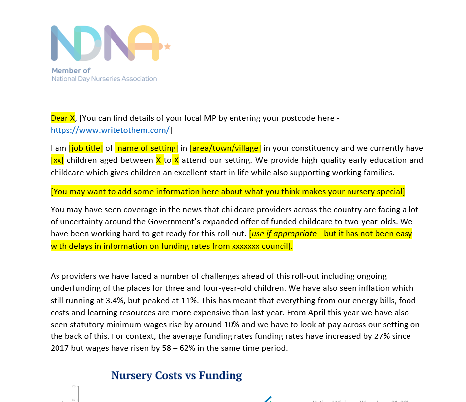 Our members have asked us to provide a template letter they can send to their local MPs and also to parents to explain about the challenges that early years providers are facing, especially regarding the higher employment costs which will come from April 2025 as a result of the Budget. Many of you are having to put up your fees as a result and need to explain why.