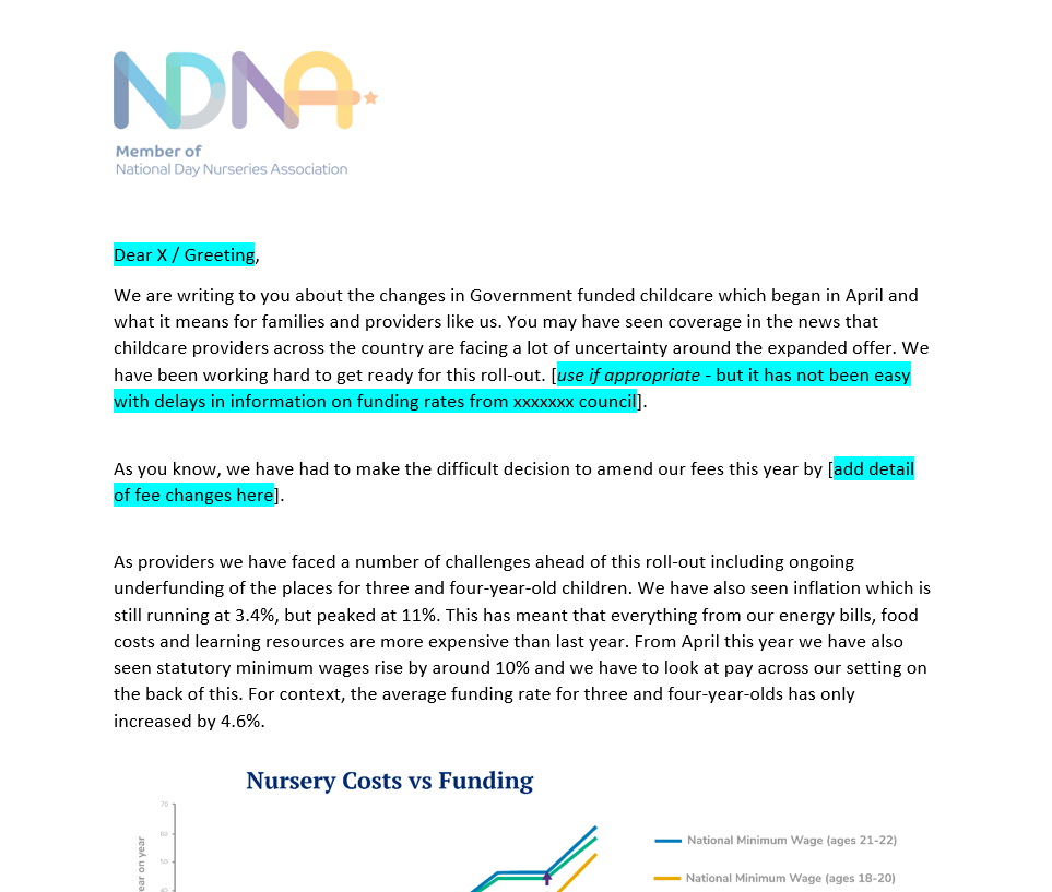 NDNA has put together a template letter – which you can adapt and update depending on your own circumstances – for you to send to parents. This explains why nurseries must ask parents to pay charges for funded places and why they are also having to put up fees to parents. You can use the letter in full or choose sections that back up your own points. We have included national background information and statistics that should support your main arguments.