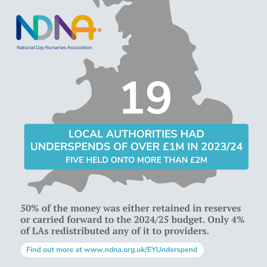 NDNA discovered that 75% of the 132 local authorities who responded to its Freedom of Information (FOI) request had underspends. This meant that a total of more than £65 million in early years entitlement funding, had not been spent on funded places at the end of 2023/24.