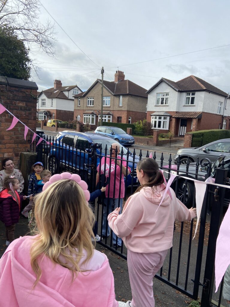 We explained to the parents what we were doing and why and they all supported us. Staff and children dressed in pink for the day, we decorated the outside of the nursery with pink flags/bunting, made breast cancer signs with the children and put them in the window and enjoyed pink activities.