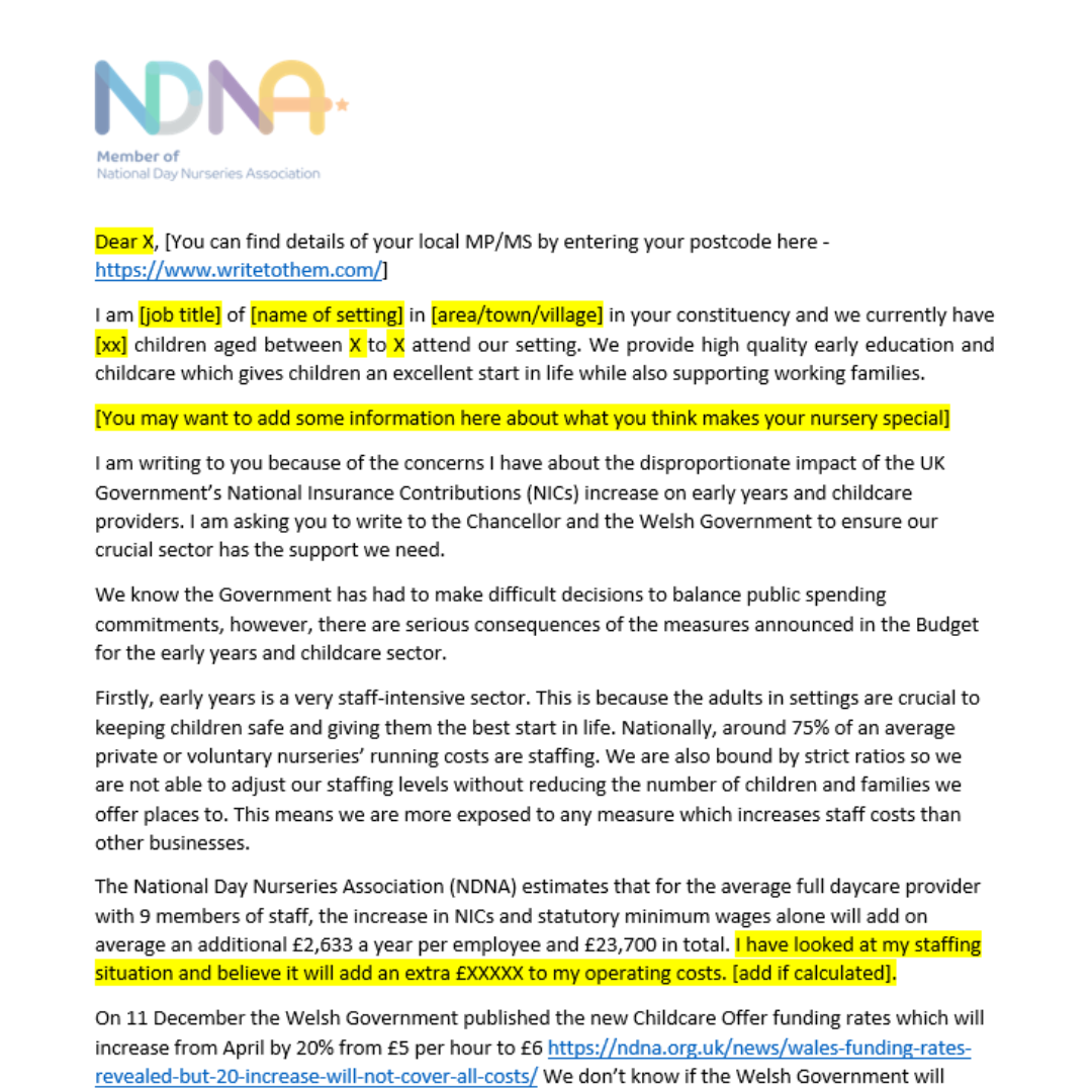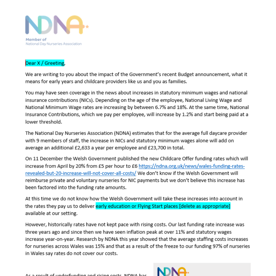 Our members have asked us to provide a template letter they can send to their local MPs/MS(s) and also to parents to explain about the challenges that early years providers are facing, especially regarding the higher employment costs which will come from April 2025 as a result of the Budget. Many of you are having to put up your fees as a result and need to explain why.