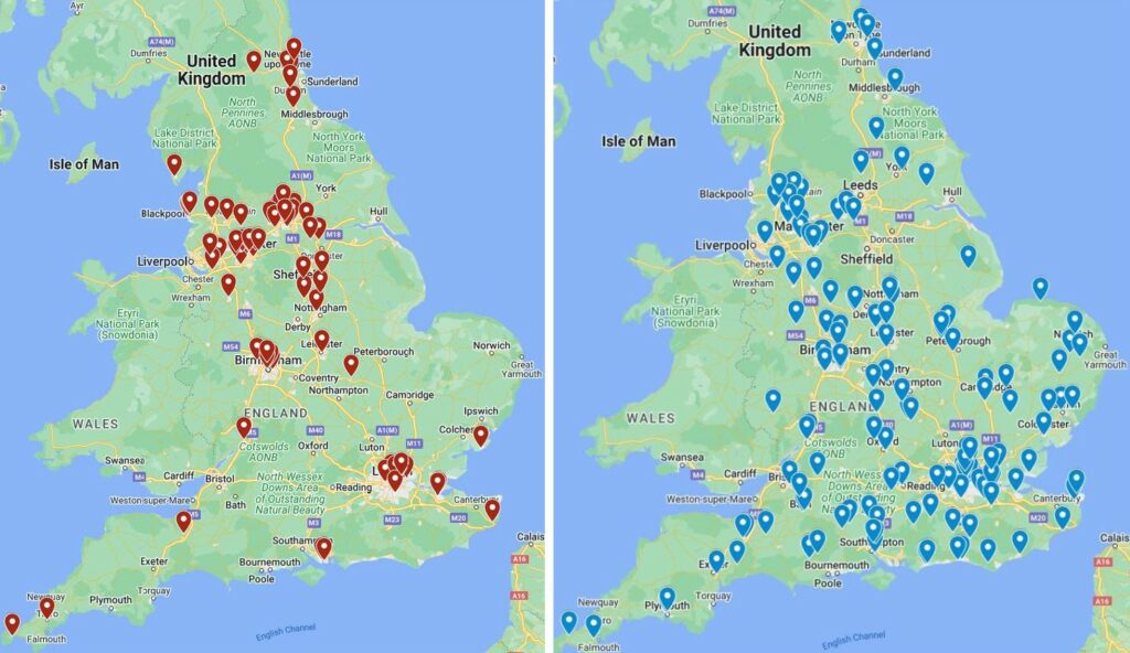 The red map shows nursery closures in the top three areas of deprivation in England and the blue map highlights the remaining seven areas.