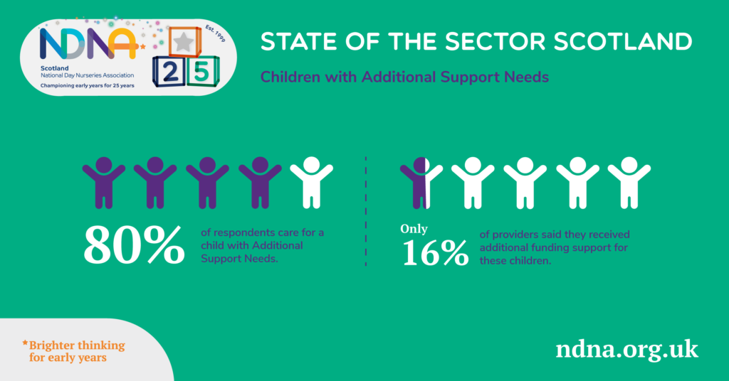 - 80% of nurseries care for children with Additional Support Needs – of these, 80% say they receive no financial support from their local authority